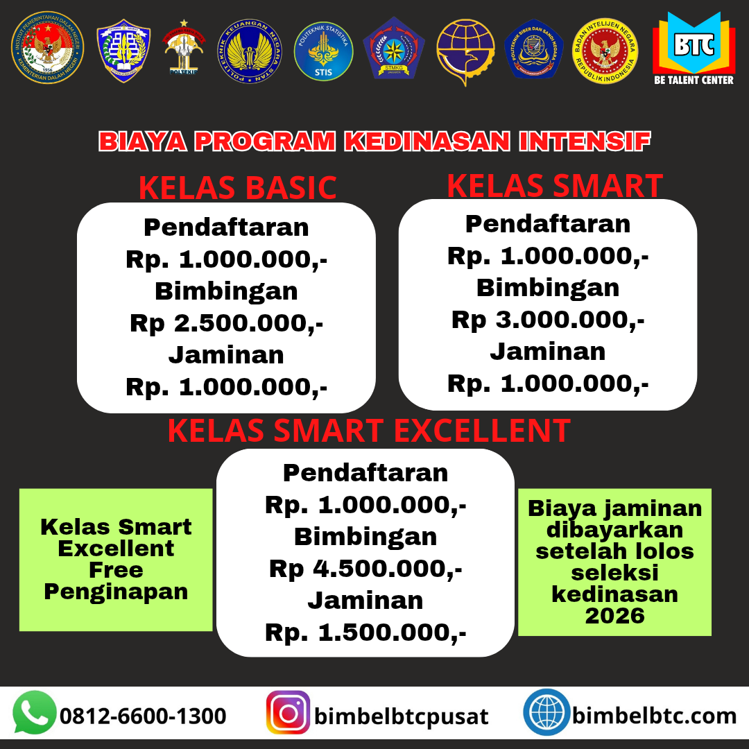 Lembaga bimbingan belajar Be Talent Center dibuka atas inisiatif Alumni Mahasiswa Kedinasan (Alumni PKN STAN, Alumni IPDN, Alumni AIM dan Alumni Sekolah Perhubungan). Kami termotivasi untuk membantu pelajar SMA / SMK mewujudkan cita cita masuk sekolah kedinasan. Masuk sekolah kedinasan membutuhkan persiapan khusus. Be Talent Center hanya menerima siswa atau pelajar yang serius dan komitmen masuk sekolah kedinasan.